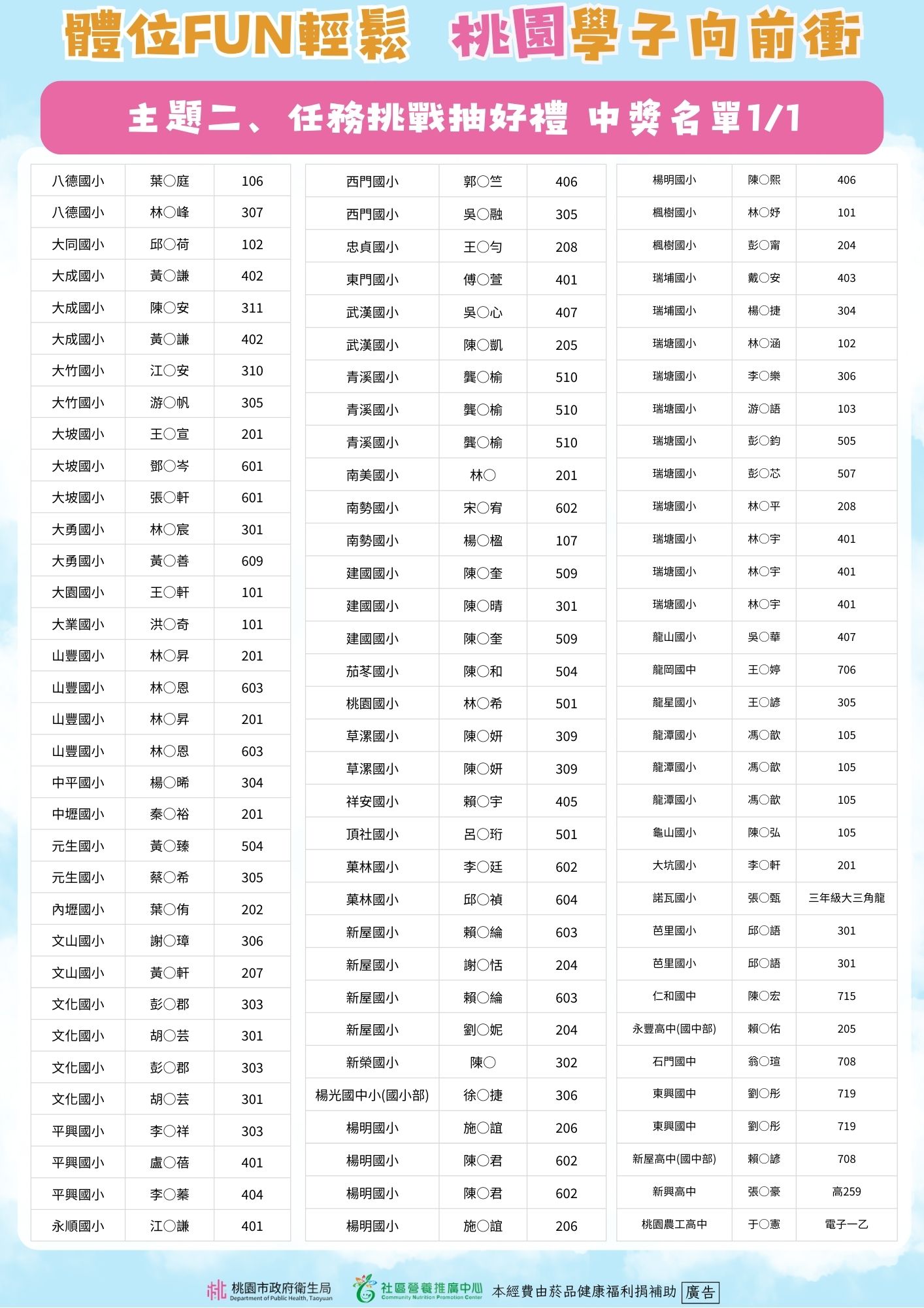 體位FUN輕鬆 桃園學子向前衝 🎉主題二、任務挑戰抽好禮得獎公告